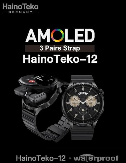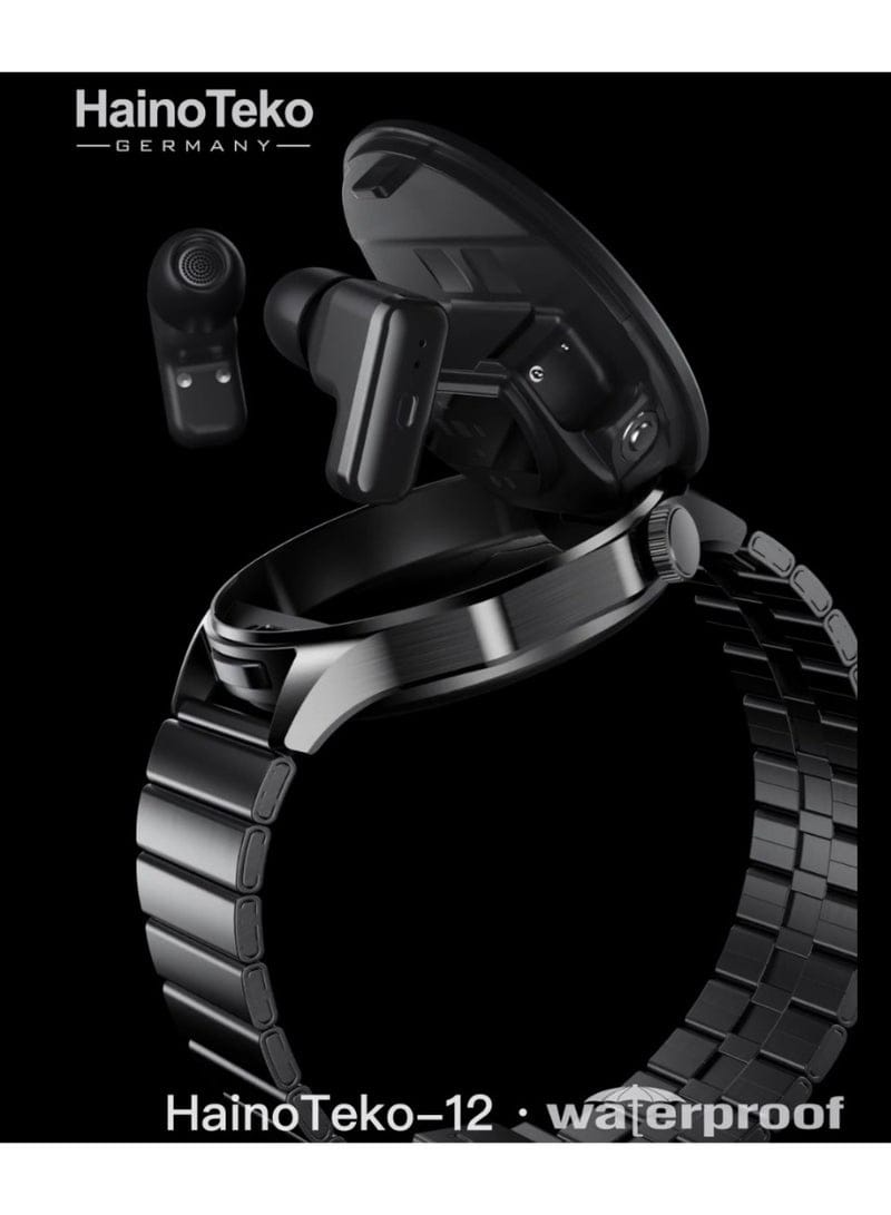 ساعة ذكية هاينو تيكو 12 مقاومة للماء مع سماعات أذن لاسلكية مدمجة وشاشة اموليد كبيرة و3 استرابات وكابل شحن لون أسود من هاينوتيكو