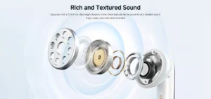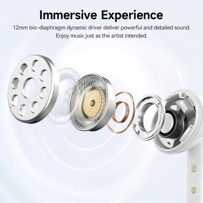 • جودة الصوت: مزودة بمحرك ديناميكي بحجم 12 ملم مصنوع من غشاء حيوي (Bio-diaphragm)، لتقديم تجربة صوتية غنية مع صوت “بيس” (Bass) قوي وتفاصيل واضحة.