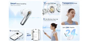• وضع الشفافية (Transparency Mode): يتيح لك سماع الأصوات المحيطة والتحدث مع الآخرين دون الحاجة لخلع السماعة، مع إمكانية تعديل مستويات الشفافية عبر التطبيق.